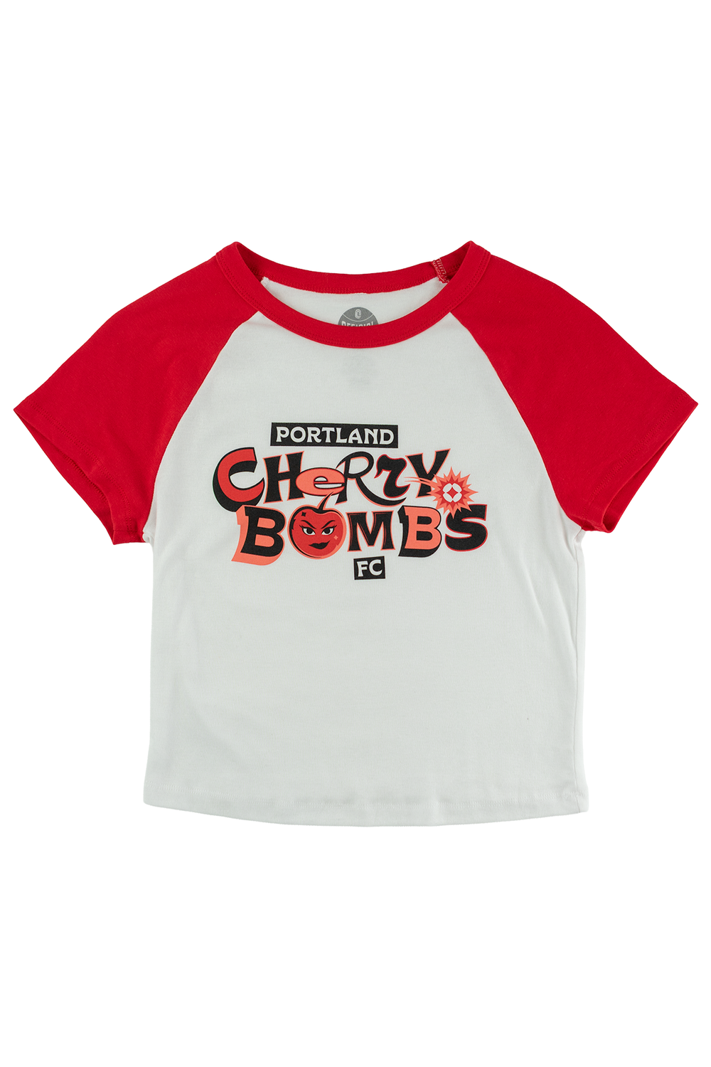 White crop baby tee with bold red sleeves and our classic Cherry Bombs wordmark across the chest. Soft cotton with a fitted, slightly cropped cut, perfect for layering or stealing the spotlight. You’ll break hearts, spill drinks, and maybe start a band, probably all before halftime.